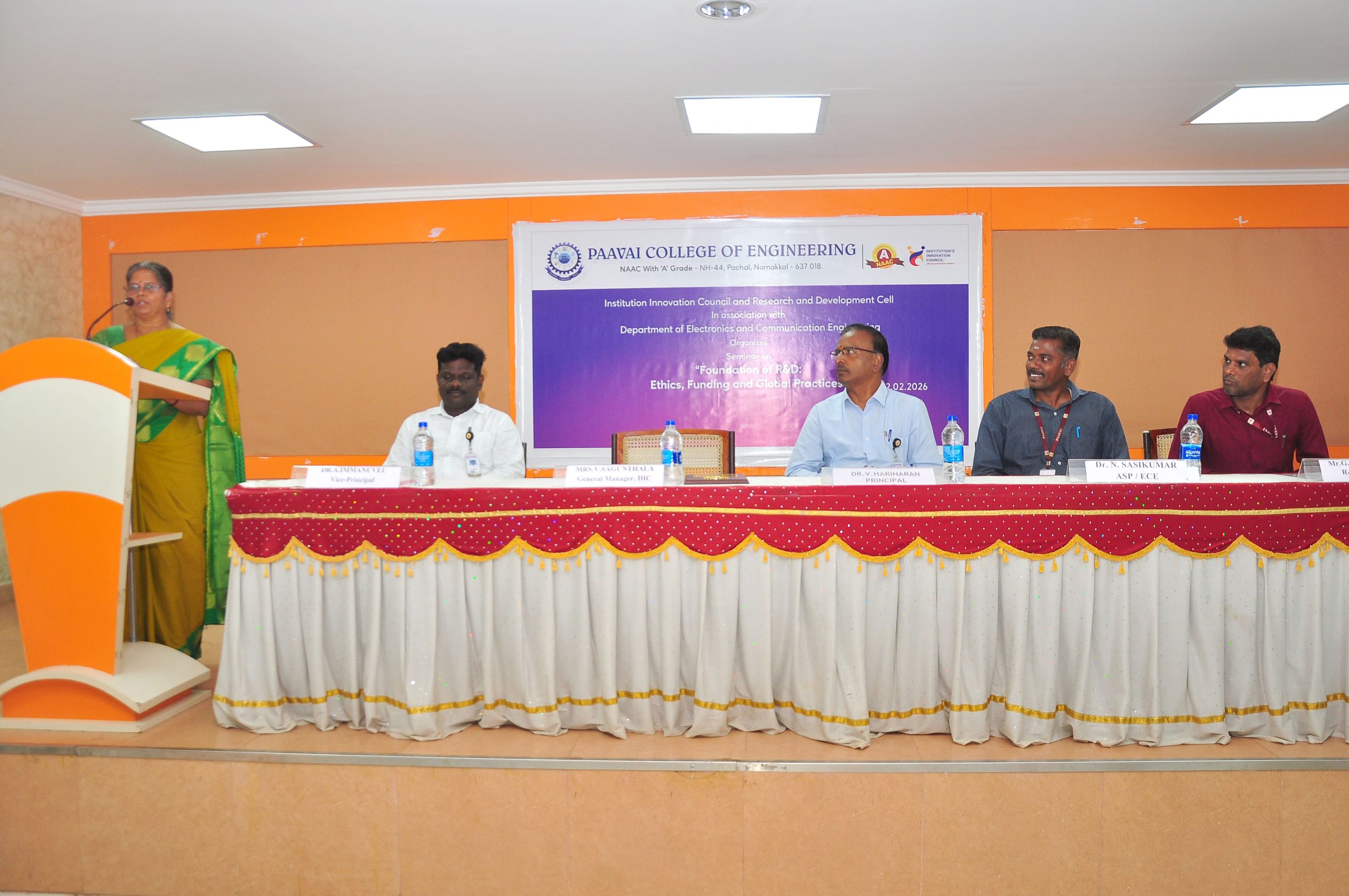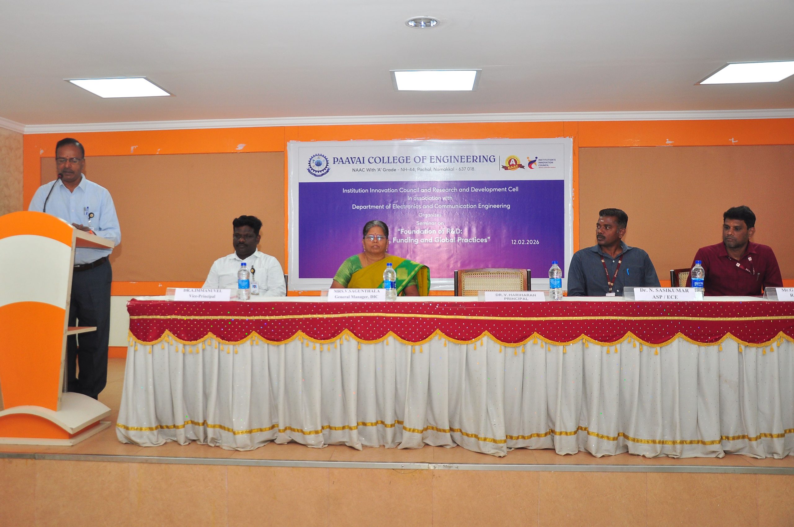 The Institution’s Innovation Council (IIC) and Research & Development Cell, in association with the Department of Electronics and Communication Engineering, Paavai College of Engineering, organized a seminar titled “Foundation of R&D: Ethics, Funding and Global Practices” on 12.02.2026 (10.30 AM to 12.30 PM) at Brilliant Hall.