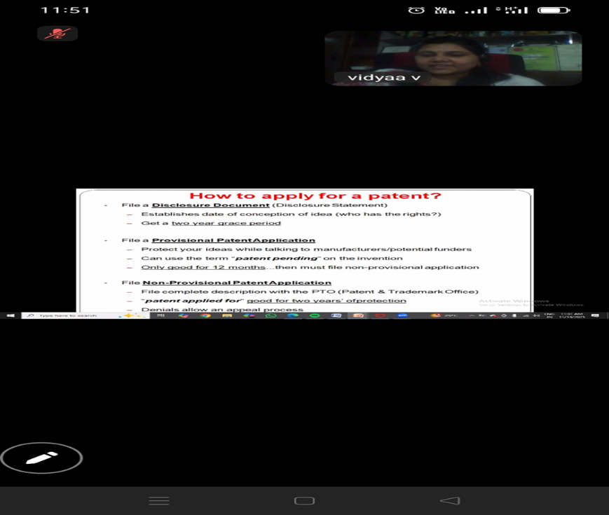 The session was led by Dr. V. Vidyaa, Founder & CEO of Vidya Intellect Consultancy Services, Anna Nagar, Chennai, who served as the resource person. Dr. Vidyaa delivered an insightful and engaging lecture, highlighting the importance of investing time and resources in research and development (R&D). She emphasized how patent licensing, technology transfer, and incubation activities contribute to building innovation ecosystems that enable nations to compete globally.