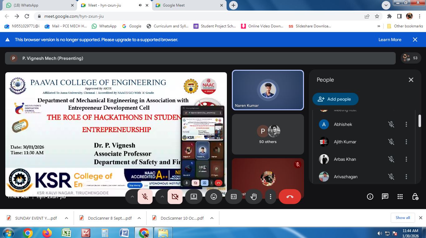 The Department of Automobile and Mechanical Engineering in Association with Entrepreneur Development Cell of Paavai College of Engineering jointly organized Online webinar on “The Role of Hackathons in Student Entrepreneurship” on 30 January 2026, 11.30 am. to 12.30 pm. The webinar was graced by the presence of Dr. V. Hariharan, Principal, Dr. A. Immanuvel, Vice Principal, Dr. J. Narendran, Head IQAC and Mr. R. Harisudhan, Head, Department of Mechanical & Automobile Engineering. The welcome address was delivered by Mr. V. Harish., Second year, B.E., Automobile Engineering. Dr. V. Hariharan, Principal, Paavai College of Engineering presided over the function. In his presidential address, he stated the importance of various technical events in updating our self with Industrial expectations.