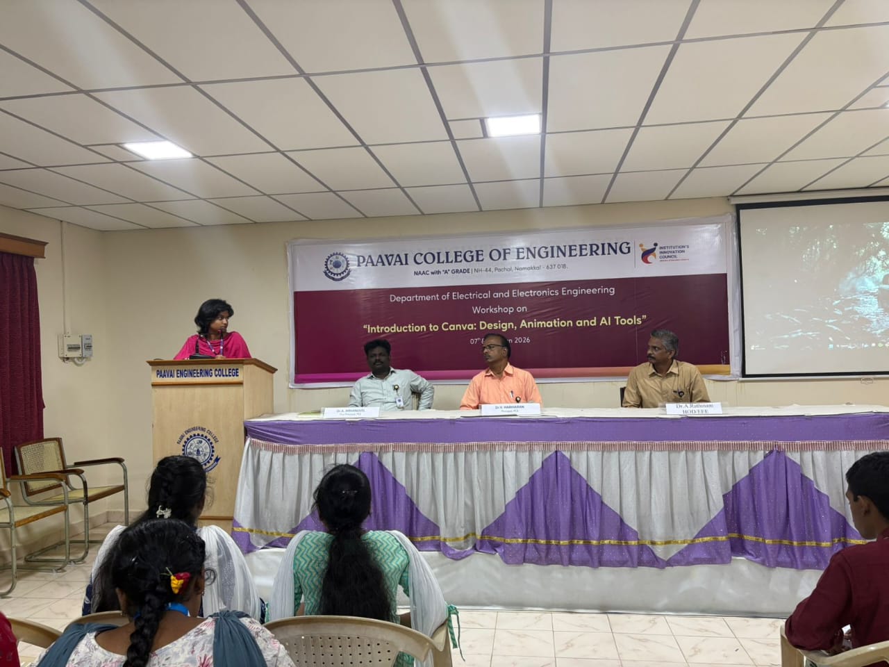 The Department of Electrical and Electronics Engineering, Paavai College of Engineering, organized a one-day workshop on “Introduction to Canva: Design, Animation & AI Tools” on 8th January 2026. The program was aimed at equipping students with modern digital design skills and AI-powered content creation techniques to enhance research dissemination and academic presentations.