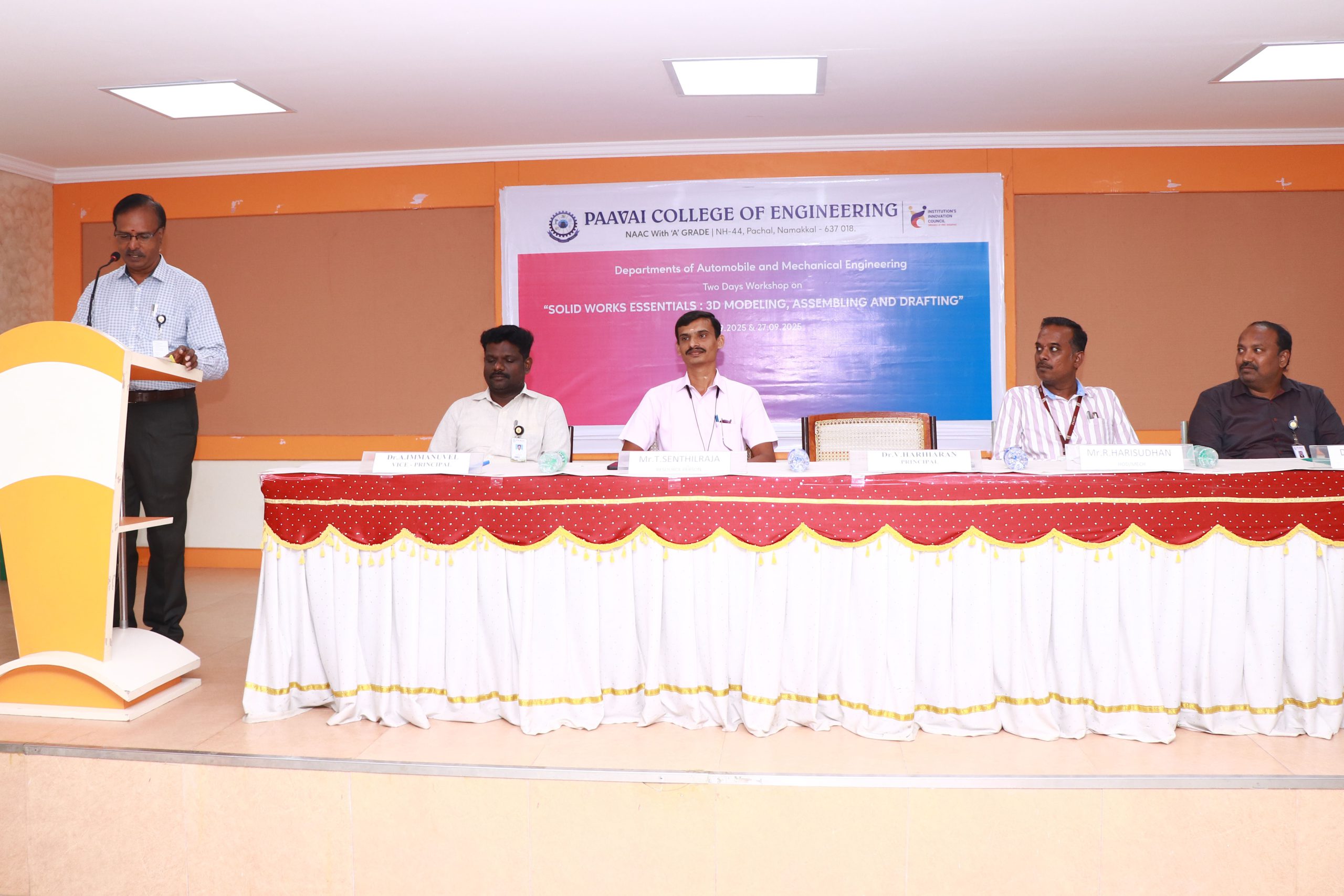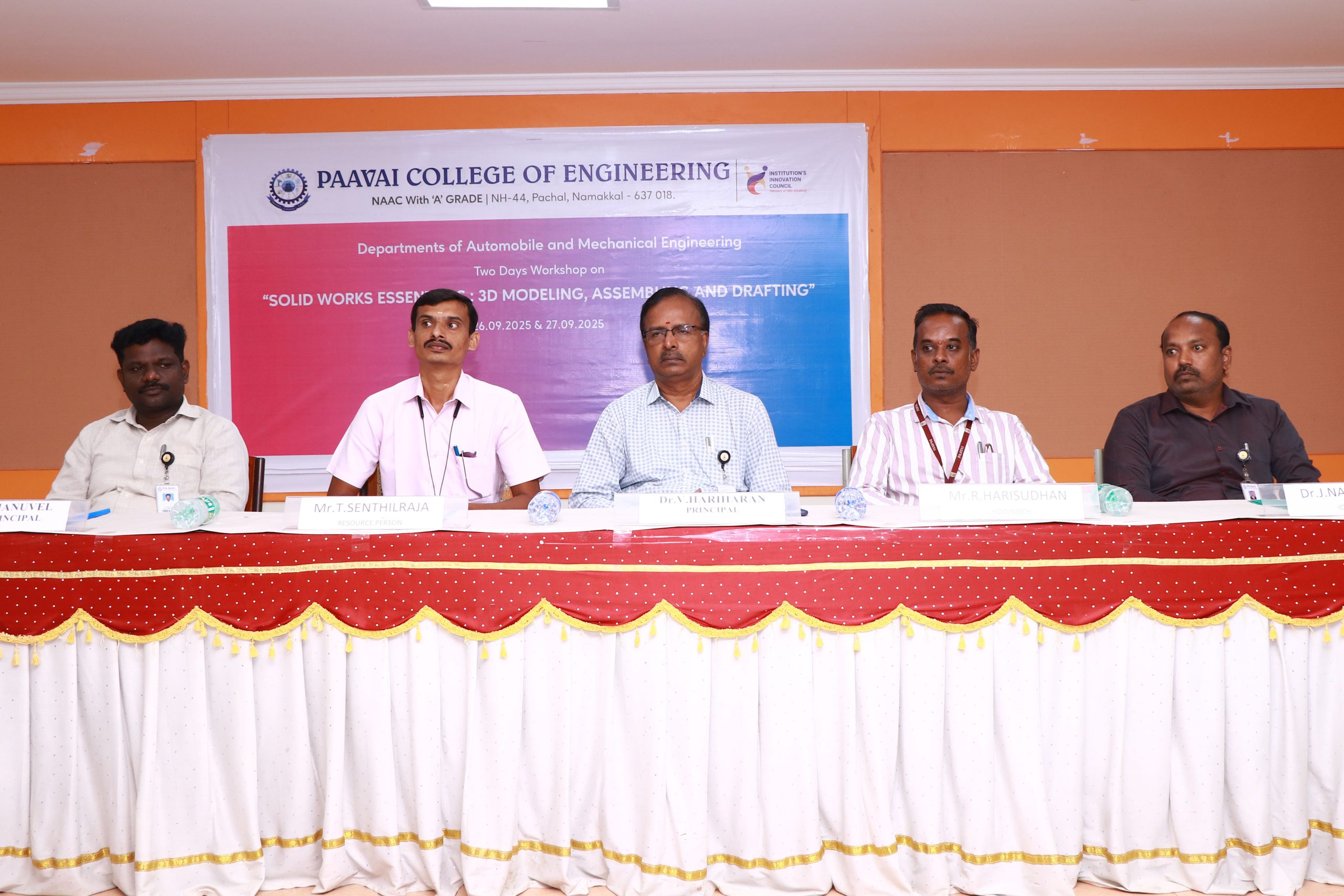 The Department of Automobile Engineering and the Department of Mechanical Engineering of Paavai College of Engineering organized a two-day workshop titled “SolidWorks Essentials: 3D Modeling, Assembling, and Drafting” on 26 and 27 September 2025.