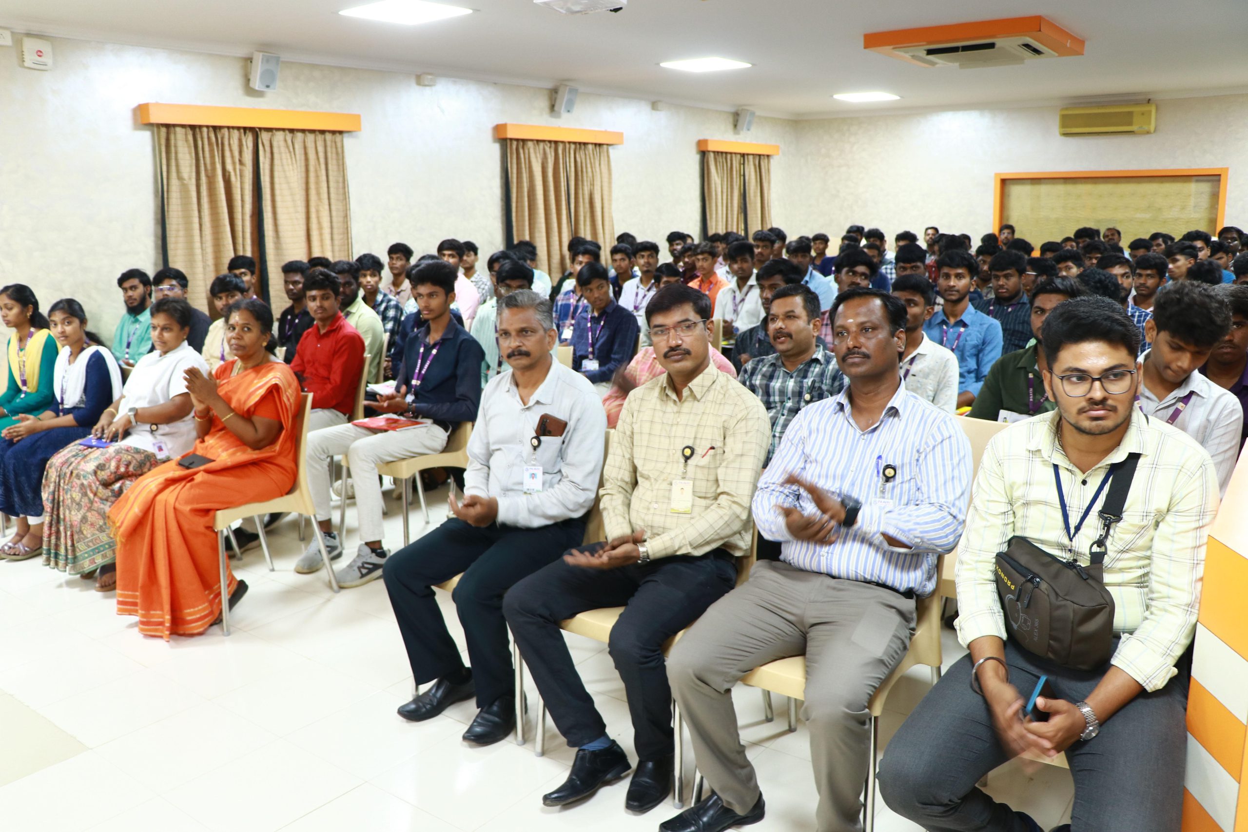 The introduction of the Chief Guest was given by Mr. M. Tamilselvan, a second-year B.E. Mechanical Engineering student. The resource person, Mr. T. Senthilraja, Green CAD Tech, Rasipuram, Namakkal, delivered the keynote address, in which he spoke about the importance of learning design software and its impact on employment opportunities.